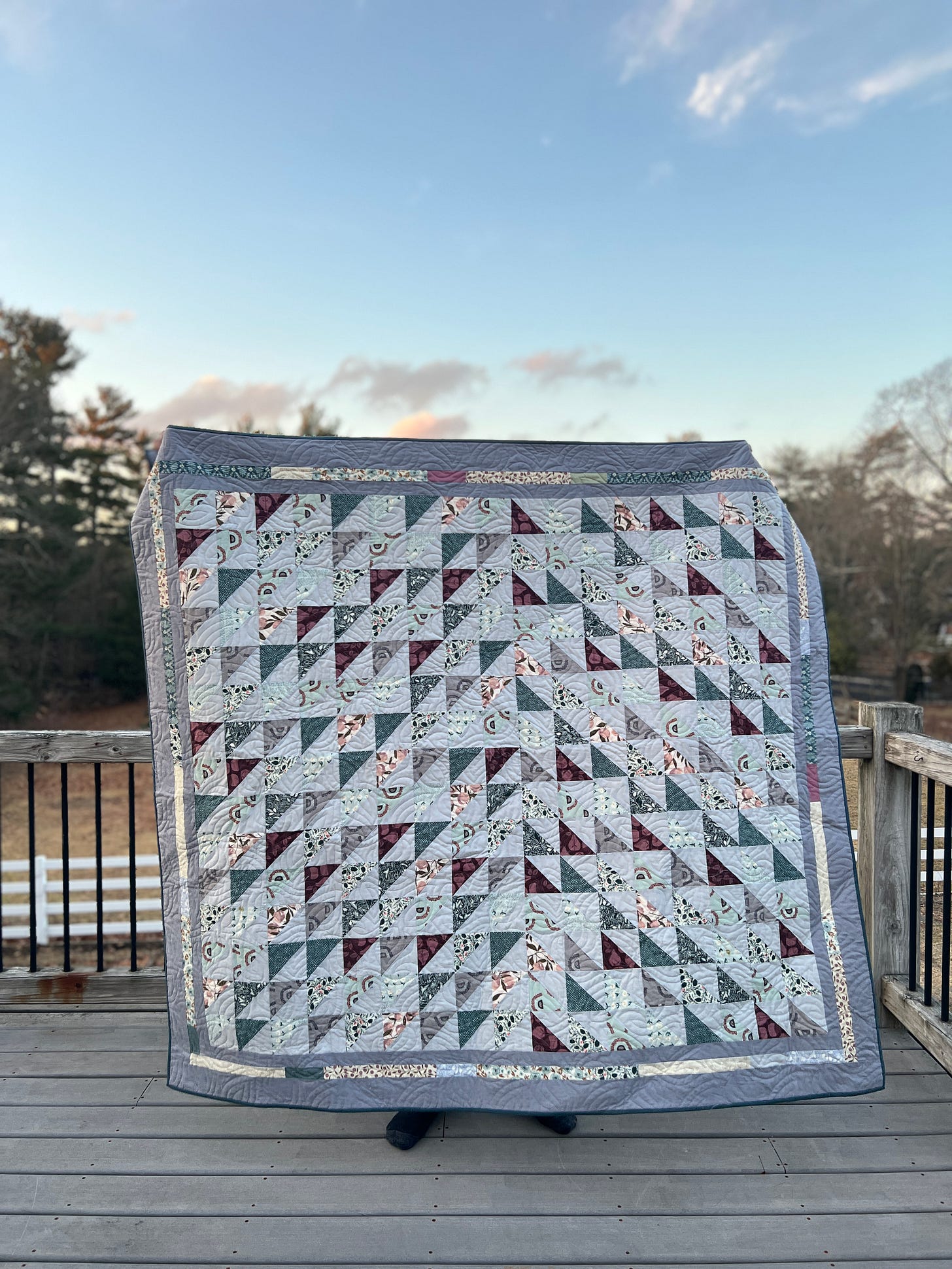 Just in time for Christmastide, I finished a quilt for my oldest. By some grace, it suits her really well, even though I pieced the quilt top while I was pregnant with her. (No pattern, just an abundance of HSTs.) The purples and blues mixed with magical woodland patterns are right up her alley. Now that this one’s off my desk, I’m working on another one for my youngest using the Peanut Butter Quilt pattern.